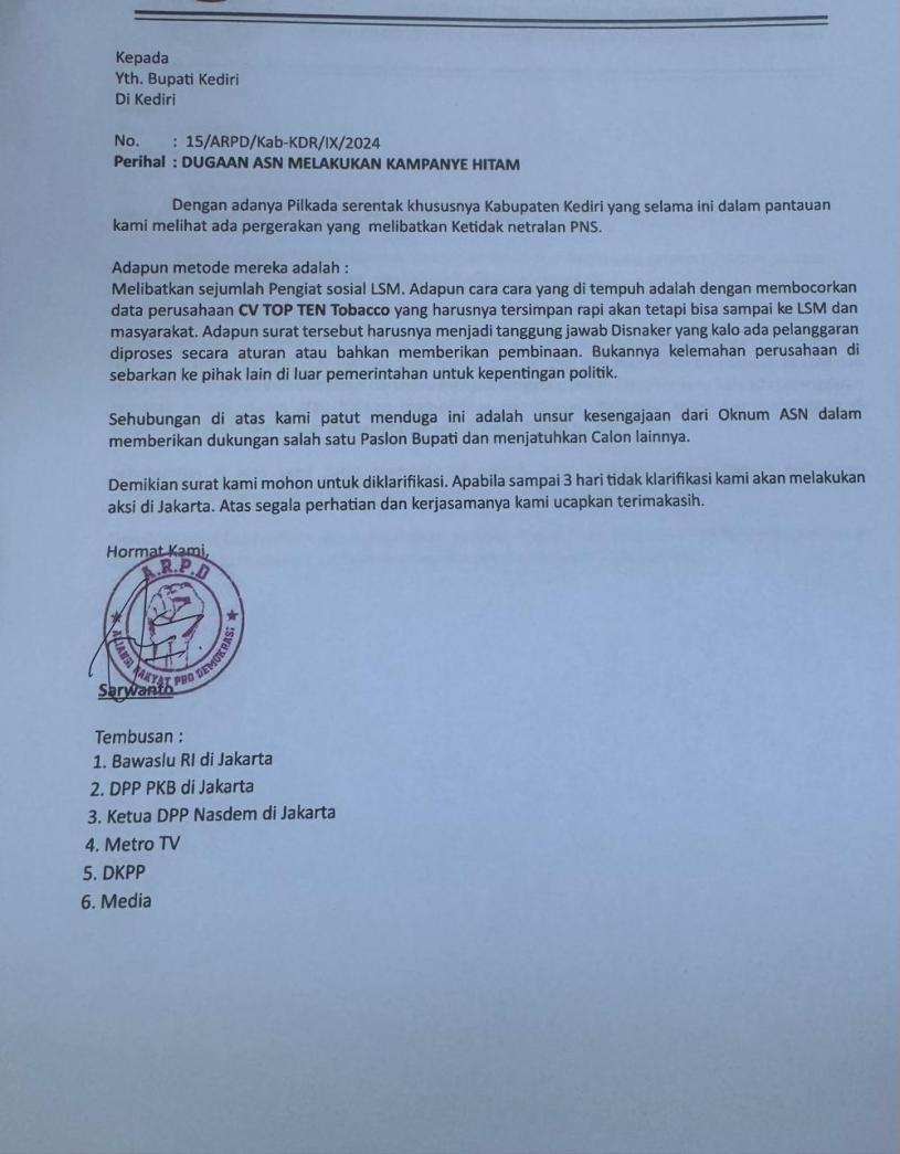 Kediri – Beredar di Medsos, Surat tanpa Kop yang ditujukan ke Bupati Kediri berisi Dugaan ASN Melakukan Kampanye Hitam.
